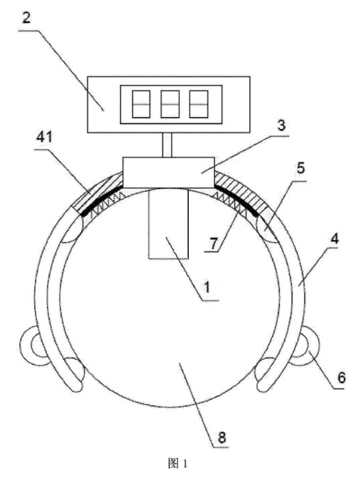 實(shí)施例:一種電磁流量計(jì)轉(zhuǎn)換器的鏈接結(jié)構(gòu),其結(jié)構(gòu)示意圖如圖1所示,包括電磁流量計(jì)本體1和電磁流量計(jì)轉(zhuǎn)換器2,電磁流量計(jì)本體和電磁流量計(jì)轉(zhuǎn)換器之間設(shè)有連接基座3,連接基座兩側(cè)向外延伸分別設(shè)有與流體管8卡接的卡爪4,卡爪為彈性件。卡爪采用金屬材料制成,卡爪靠近基座部分為彈性層41。卡爪面向流體管一側(cè)設(shè)有若干個(gè)凸點(diǎn)5,凸點(diǎn)采用橡膠材料制成。卡爪背離流體管一側(cè)設(shè)有把手6。卡爪和流體管之間靠近基座處設(shè)有限位彈簧7。當(dāng)電池流量計(jì)轉(zhuǎn)換器需要拆卸時(shí),因?yàn)榭ㄗ閺椥约?相關(guān)操作人員稍稍用力即可向外掰開卡爪,并通過抓住把手旋轉(zhuǎn)卡爪,使電池流量計(jì)轉(zhuǎn)換器方便的拆卸脫離連接基座。