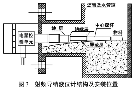 為了解決生產(chǎn)中因?yàn)橐何挥?jì)故障影響正常生產(chǎn)的問(wèn)題,通過(guò)查閱相關(guān)資料、尋找同類型測(cè)量物位的裝置,結(jié)合公司設(shè)備工作環(huán)境、設(shè)備工藝要求和使用需求,經(jīng)過(guò)前期反復(fù)論證,zui終選用射頻導(dǎo)納液位計(jì)進(jìn)行安裝、試用。在訂購(gòu)設(shè)備時(shí),要求廠家制作與現(xiàn)場(chǎng)同型號(hào)大小的連接法蘭,保證探測(cè)桿的有效長(zhǎng)度,以及需要傳輸信號(hào)的要求電壓,以減少對(duì)現(xiàn)有管道、線路的改動(dòng)。射頻導(dǎo)納液位計(jì)結(jié)構(gòu)及安裝位置如圖3所示。