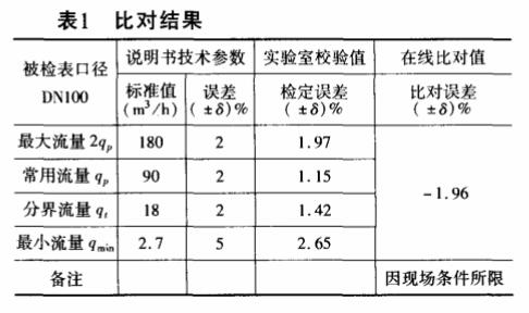 在使用現場,該流量計在線測量供水流量。檢測設備采用日本富士便攜式超聲波流量計作為比對表(該比對表通過國家大流量檢測站校準,并取得了檢定證書),準確度為.5%,對在線電磁流量計進行比對,比