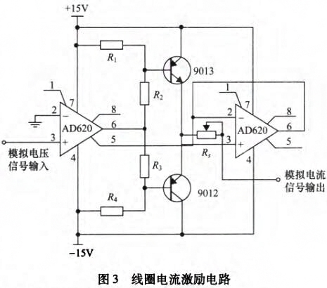 電磁流量計(jì)感應(yīng)電壓檢測模塊主要由勵磁電路和弧狀電極傳感器組成,其中勵磁電路用來在流體測量區(qū)域產(chǎn)生盡量均勻的磁場分布,而內(nèi)嵌在管道內(nèi)壁與流體接觸的弧狀電極傳感器則負(fù)責(zé)拾取帶有流體速度參數(shù)的感應(yīng)電壓信號。為在流體測量區(qū)域產(chǎn)生盡可能均勻的磁場,勵磁線圈采用馬鞍形線圈。在勵磁系統(tǒng)設(shè)計(jì)中,鐵芯可以提供磁通路徑,從而改變磁場分布,并加強(qiáng)磁感應(yīng)強(qiáng)度。同時(shí),為降低鐵芯渦流損耗以及增加磁路導(dǎo)磁系數(shù)鐵芯采用表面涂有絕緣漆的薄硅鋼片疊加而成。在鐵芯上套上馬鞍形線圈即組成勵磁系統(tǒng)。直流勵磁使得弧狀電極拾取的感應(yīng)電壓中存在極化電壓信號,而交流勵磁則會引起的正交干擾和同相干擾。因此,為克服直流勵磁和交流勵磁存在的缺點(diǎn),設(shè)計(jì)采用在線圈中施加頻率∫=6.25Hz的低頻矩形波勵磁方式。勵磁電路主要包括AD620和AD711組成的壓控電流源電路和三極管9013和9012組成的互補(bǔ)對稱推挽型功率放大電路,如圖3所示,模擬電壓信號由PXI模塊的模擬信號輸出端給出。
