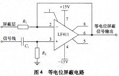 電極之間的感應(yīng)電壓是非常微弱的交變信號,而且包含各種噪聲干擾信號,因此為有效采集感應(yīng)電壓信號,檢測信號必須進(jìn)行信號處理。信號處理模塊主要包括等電位屏蔽電路、前置放大電路、濾波電路、可編程放大電路以及釆樣保持電路幾個(gè)部分。為保證外部電磁場不對傳輸信號的信號線產(chǎn)生干擾,采用屏蔽電纜輸出電極上的微弱信號。然而在屏蔽電纜屏蔽層和信號線之間存在著分布電容和分布電阻,其中分布電容一般高于放大器輸入電容,分布電阻幾乎等于放大器輸人電阻,這給信號的檢測帶來很大的影響。采用等電位驅(qū)動屏蔽電纜電路可以避免屏蔽電纜分布電容和分布電阻影響,如圖4所示