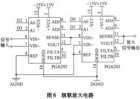 通過調(diào)整電阻R1完成即可設(shè)置增益范圍為1-10000倍的調(diào)整。經(jīng)前置放大電路后,電極之間的電動勢由差動信號變?yōu)閱味诵盘枴R驕y量電路存在噪聲干擾,前置放大電路輸出信號中存在直流偏置和基線漂移,同時(shí)還存在高頻尖峰噪聲,因此需采用濾波電路對雜散信號進(jìn)行抑制。設(shè)計(jì)采用具有低輸入失調(diào)電壓、低輸入偏置電流、高開環(huán)增益和高共模抑制比的OP07組成二階壓控電壓源型高通濾波(截止頻率0.034Hz)和低通濾波(截止頻率72Hz)級聯(lián)電路。濾波電路輸出信號幅度較小,因此需經(jīng)次級放大電路提高增益。設(shè)計(jì)采用可編程儀表放大器PGA202與PGA203組成的級聯(lián)放大電路,如圖6所示。