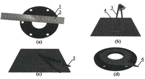 2.在石棉板上確定圓心,用規(guī)劃分別在石棉板上劃出法蘭墊片內(nèi)外圓和長約5cm的操作手柄如圖2(b)所示