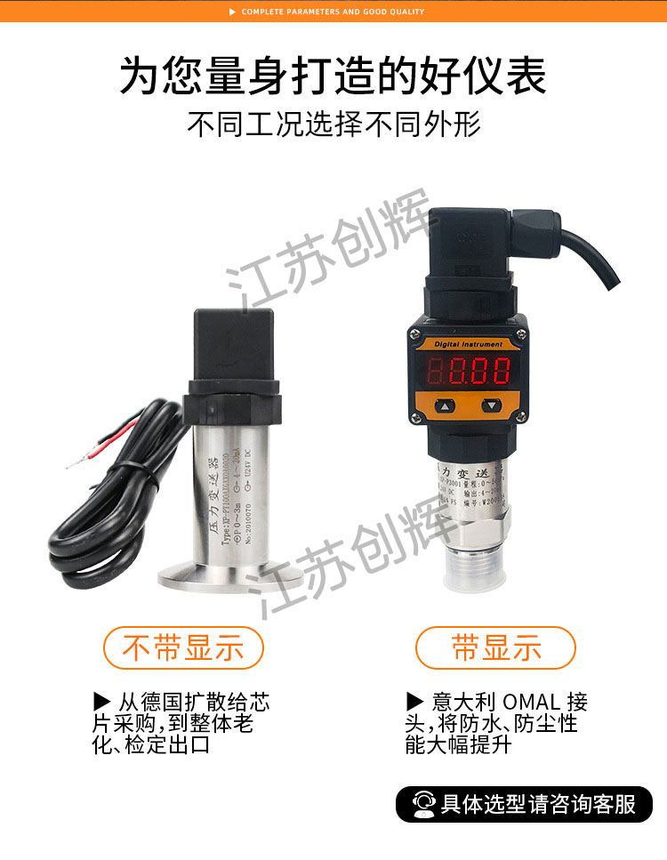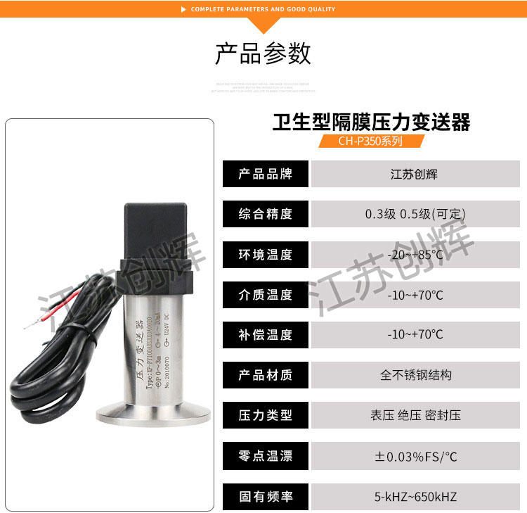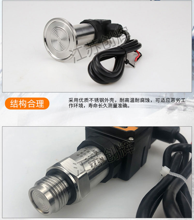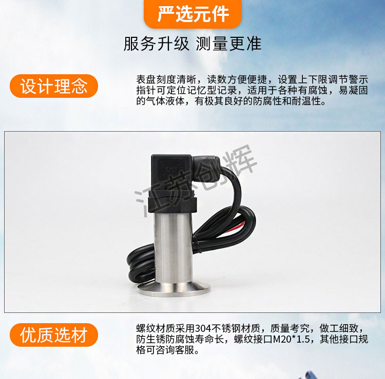 CH-2088W衛(wèi)生隔膜壓力變送器是專門為醫(yī)藥、啤酒、奶倉等醫(yī)藥食品領(lǐng)域設(shè)計的專用型產(chǎn)品,該系列采用E+H**技術(shù),其設(shè)計完全遵照醫(yī)藥食品行業(yè)的衛(wèi)生級標準。利用齊平大波紋片使測量介質(zhì)與壓力傳感器相隔離,其間灌充衛(wèi)生及專用油,可保證在介質(zhì)溫度150℃的高溫下無溫漂的穩(wěn)定工作。客服了目前工業(yè)現(xiàn)場上常用齊平式擴散硅或陶瓷電容變送器因傳感器直接接觸介質(zhì),從而在高溫情況下溫漂大,導致超差,尤尤其是滅菌環(huán)境節(jié)時變送器極容易損壞的弊病。