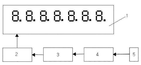 如圖1所示,本實施例所提供的一種用于電磁流量計的遠距離流量顯裝置,包括LED數(shù)碼管1和LED驅動芯片2,其特征在于:還包括單片機3、RS485通信芯片4和RS485通信連接件5;
